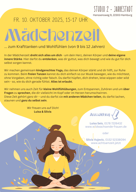 Gemeinsam entdecken wir durch kindgerechtes Yoga, freies Tanzen und kleine Entspannungsübungen Wege zu mehr Selbstvertrauen, Körperbewusstsein und innerer Ruhe. Die Mädchen dürfen sich frei bewegen, sich ausdrücken und lernen, achtsam mit sich selbst umzugehen.